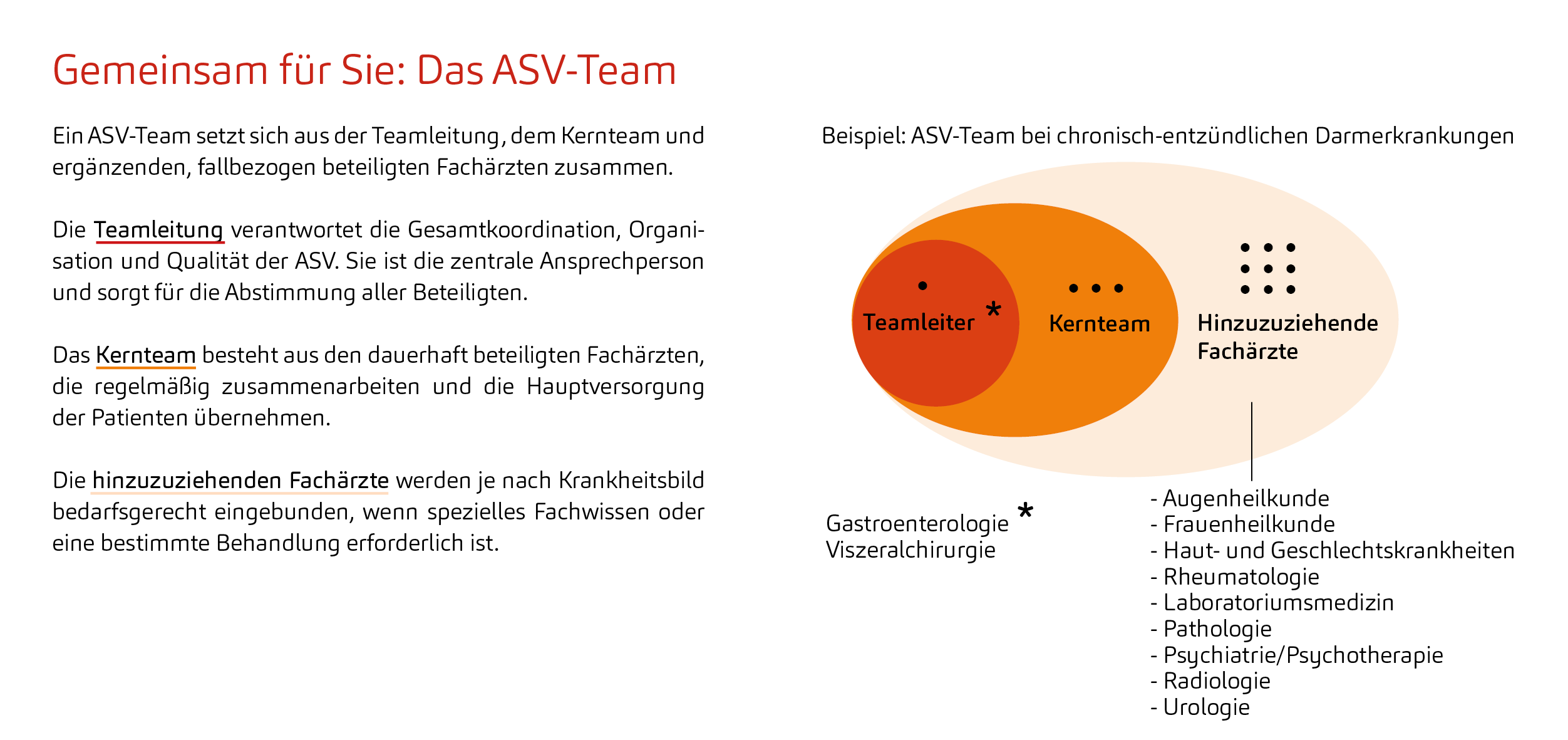 Die ASV ist ein Angebot für Patient:innen mit bestimmten seltenen oder sehr komplexen Krankheiten. In der ASV arbeiten Ärzte verschiedener Fachrichtungen in einem eigens für diese Erkrankungen zusammengestellten Team eng zusammen. Durch die Bündelung der Fachexpertise und Erfahrung wird die medizinische Versorgung optimiert und eine umfassende, ganzheitliche und individuelle Behandlung gewährleistet.